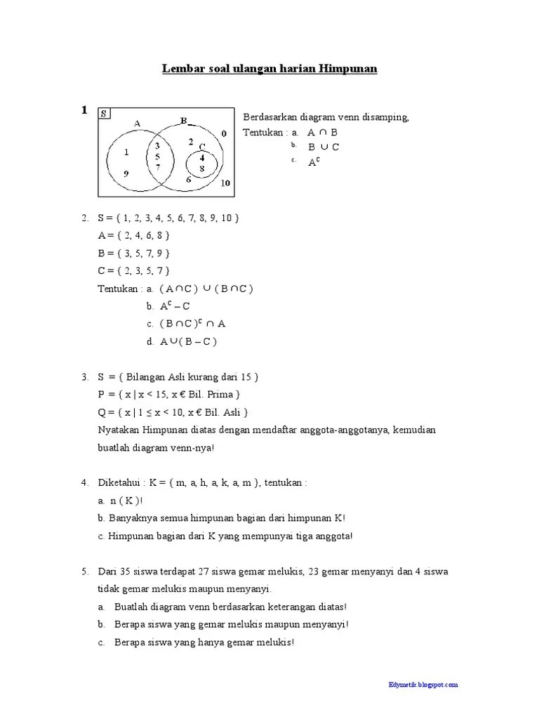 Soal himpunan untuk kelas 7 smp. Soal ulangan harian matematika kelas 7 materi himpunan. Oleh karena itu jawaban x dari 4 x 6 adalah 2. Pada kesempatan kali ini kakak ingin berbagi lagi mengenai beberapa contoh soal himpunan matematika kelas 7 smp, soal ini sudah kakak susun sedemikian sehingga tersusun sebanyak 25 soal yang sudah termasuk dengan kunci jawabannya. 30 full pdfs related to this paper.